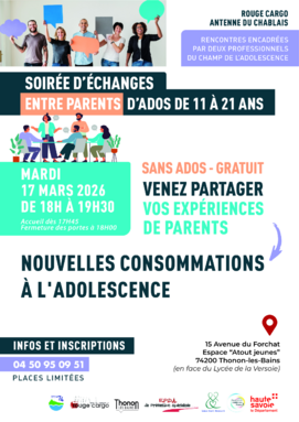 Par Sabine Bonnet, publié le vendredi 6 mars 2026 10:12 - Mis à jour le vendredi 6 mars 2026 10:12Vous trouverez en pièce jointe, une affiche concernant la prochaine soirée d'échanges destinés aux parents d’adolescents proposée au sein de l’antenne MDA du Chablais. -